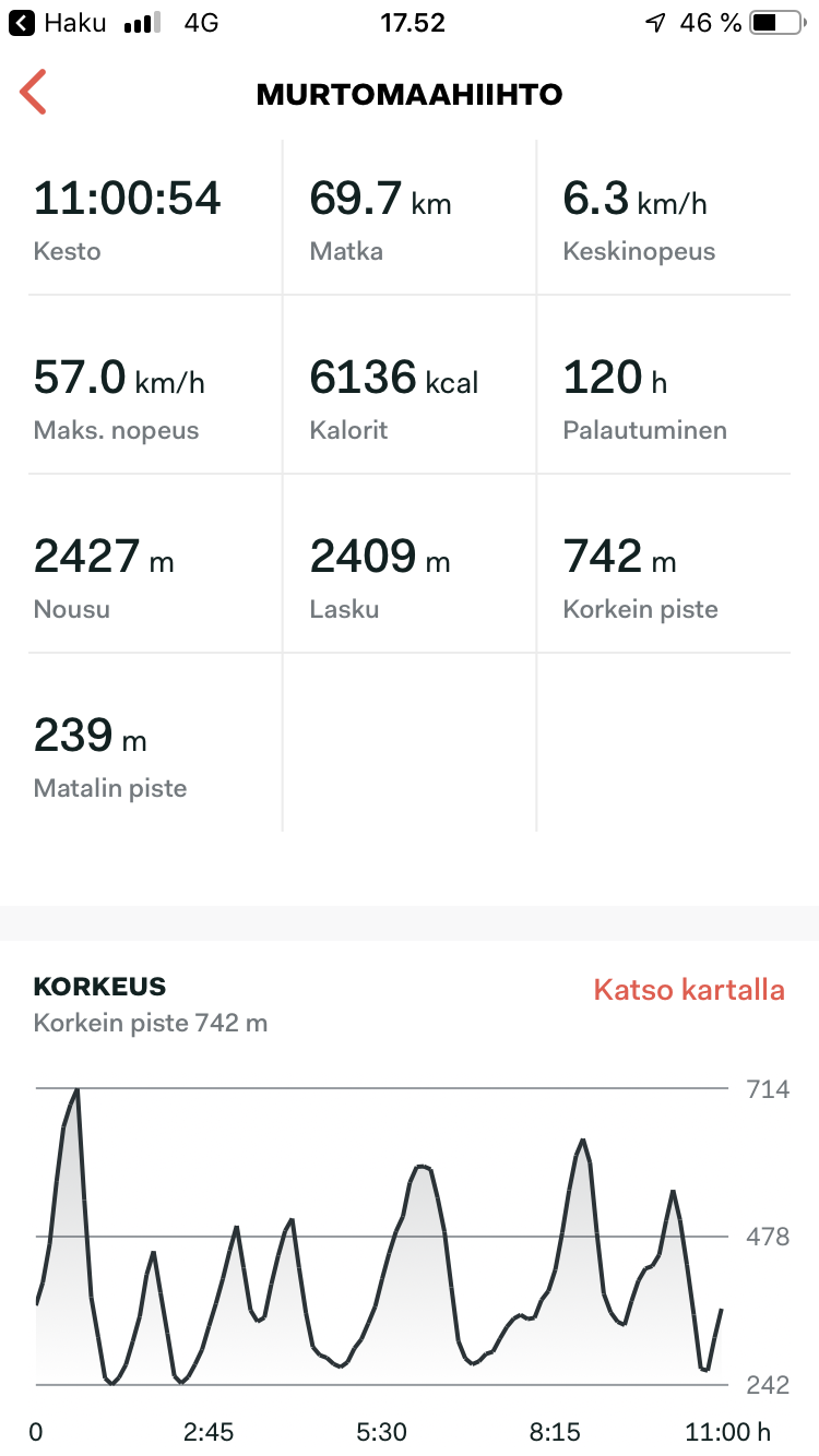 Maalissa kirjattiin uupuneina ajassa 10:57:55. Oma Garmin oli sammunut matkan varrella, mutta Matin Sports Tracker oli kirjannut 69,7 km. Sidekin kesti maaliin asti ja kaikkien voimat riittivät koko reissun. Ei tullut tänä vuonna tunturit helpolla saati halvalla. Tai tunturiosuudet kulkivat ihan mukavasti, mutta ladulla oli rankkaa. Oma kunto ei ollut ihan 100 % ja toisaalta olosuhteet olivat eittämättä raskaat.